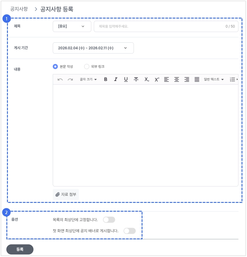 내용 작성 및 자료 첨부 : 에디터를 활용해 본문을 작성하거나 외부 링크를 연결할 수 있습니다. 수업에 필요한 파일이 있다면 [자료 첨부] 버튼을 통해 업로드하세요.
