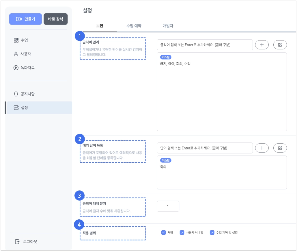적용 범위 : 금칙어 필터링을 적용할 범위를 채팅, 사용자 닉네임, 수업 제목 및 설명 중에서 선택할 수 있어요.